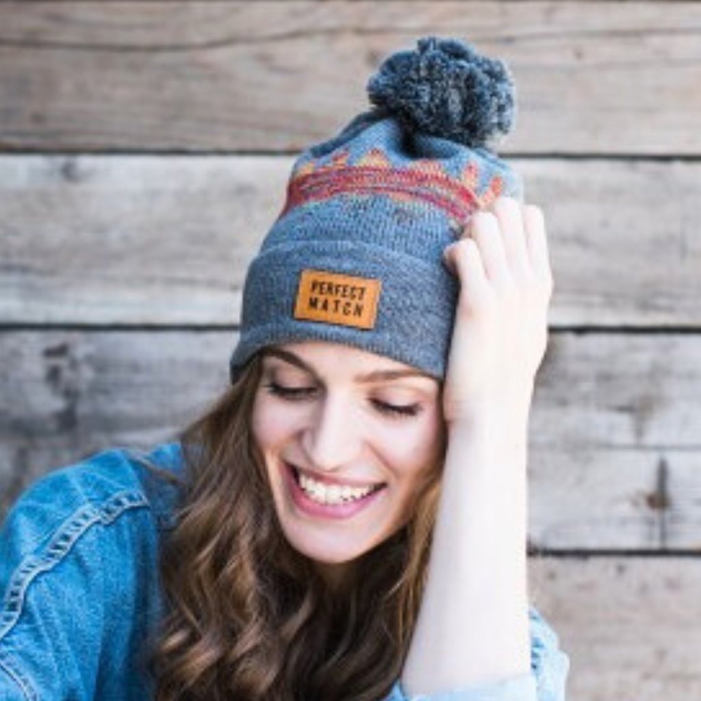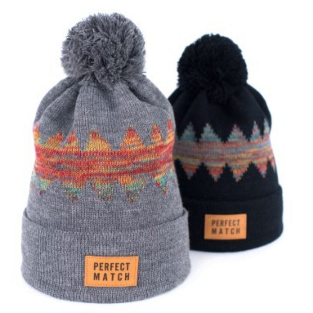 Pohodlná čepice s bambulí. Zdobí je barevná aplikace a nášivka z umělé kůže s nápisem "Perfect match".