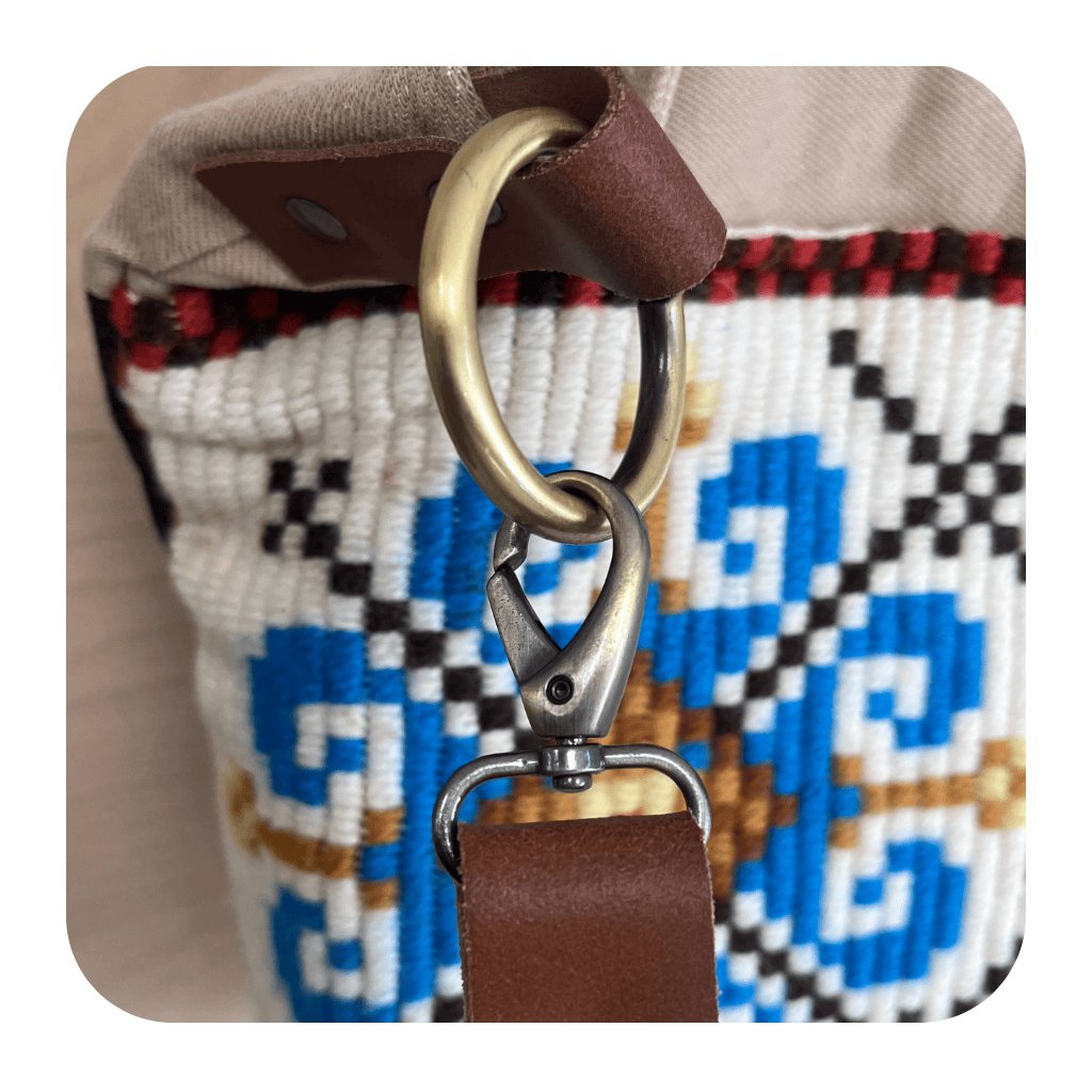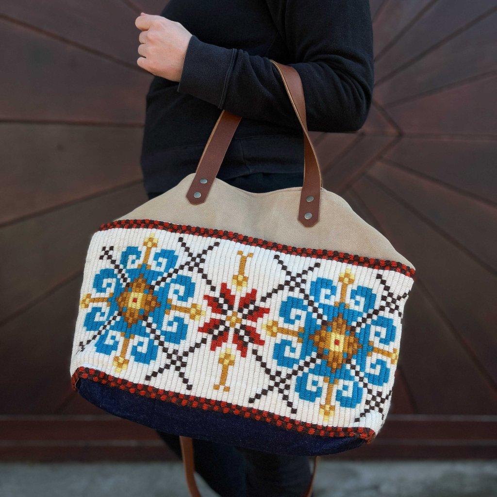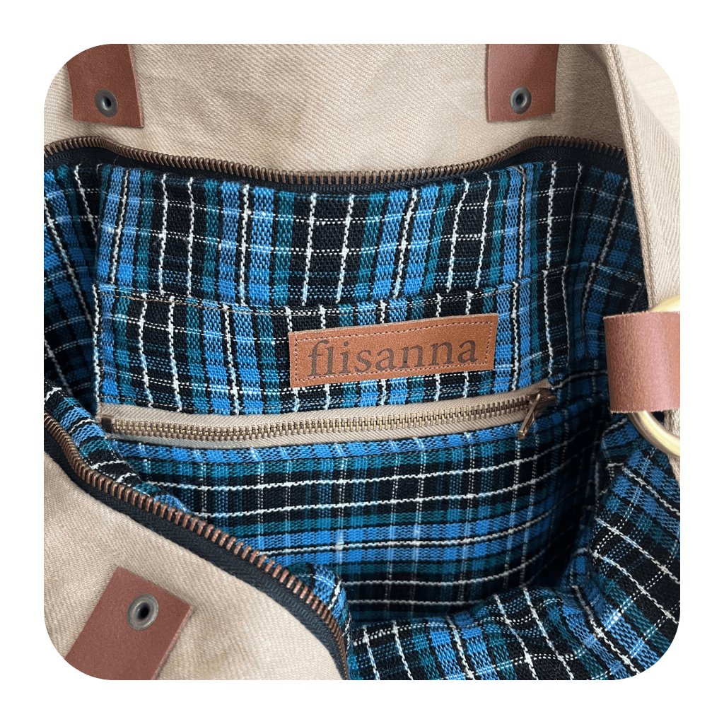 Ručně šitá kabelka z dílny designérky Anny Flis. Vyrobeno z hrubé tkaniny, džínoviny s koženými prvky.