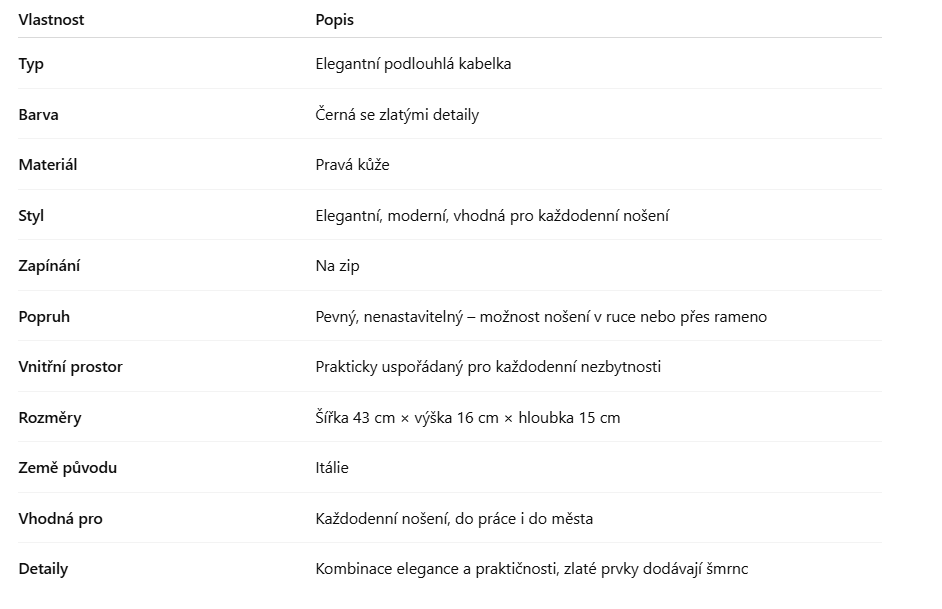 Černý elegantní design se zlatými detaily dodává kabelce šmrnc, který skvěle doplní jakýkoli outfit. Díky nastavitelnému popruhu ji můžete pohodlně nosit přes rameno nebo v ruce – stylově a pohodlně na každou příležitost.
