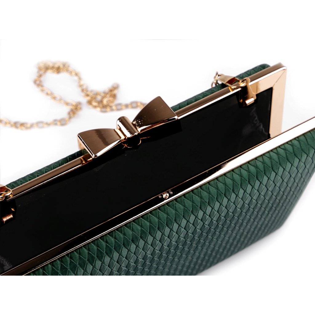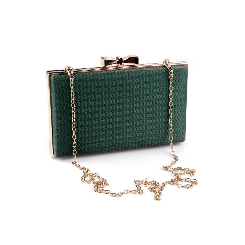 Malá společenská kabelka vyzařuje eleganci a luxus, má zajímavou povrchovou strukturu se saténovým leskem. Zdobí ji výrazné lesklé zapínání ve tvaru mašle a rámeček po celém obvodu. Kabelka je pevně vyztužená, její součástí je dlouhý odnímatelný řetízek na karabiny. Můžete ji nosit v ruce nebo jako crossbody přes rameno či do kříže.
