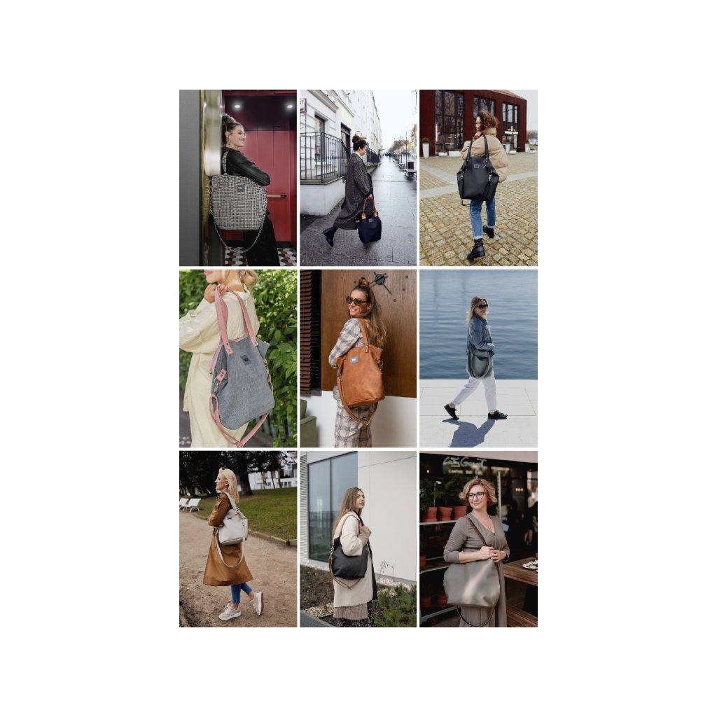 Střední taška z hrubé tkaniny v barvě šedé. Uvnitř je silná bavlněná podšívka, a tři kapsy - dvě otevřené a jedna se uzavírá pomocí zipového uzávěru. Taška má pevný popruh. Je přidělána na čtyřech nýtech (uších) z eko-kůže. Je možné ji nosit volně přes rameno nebo si nastavitelným popruhem ze stejného materiálu upravit tašku pro nošení diagonálně (crossbody).