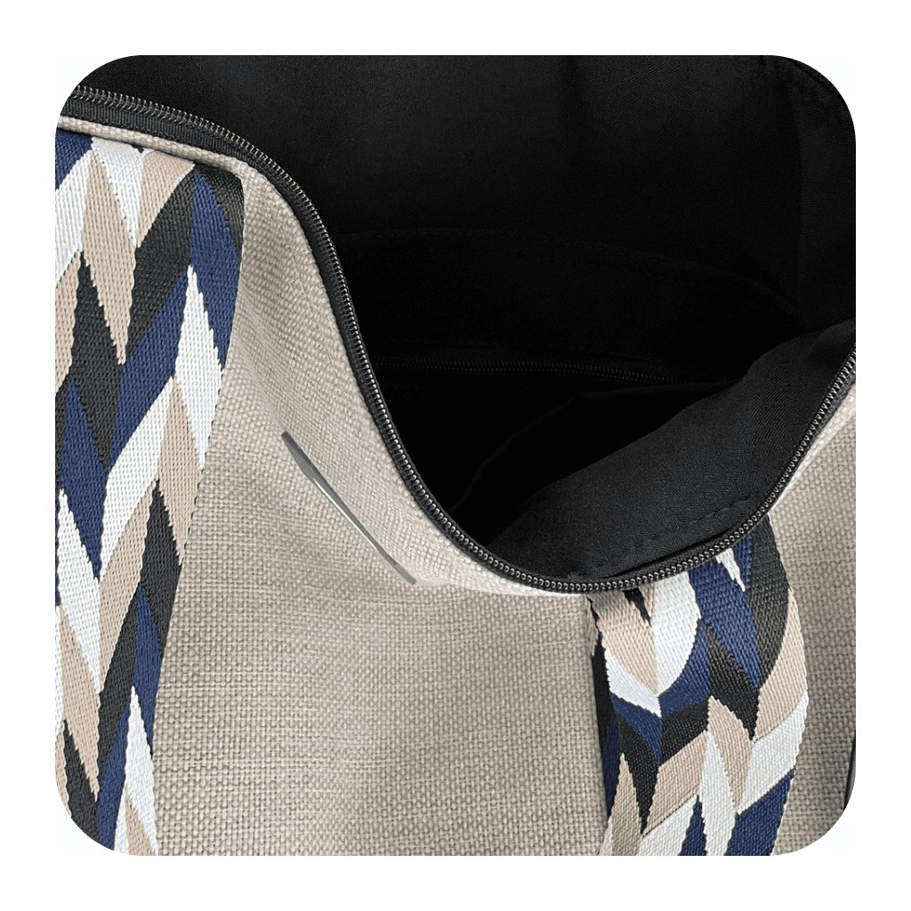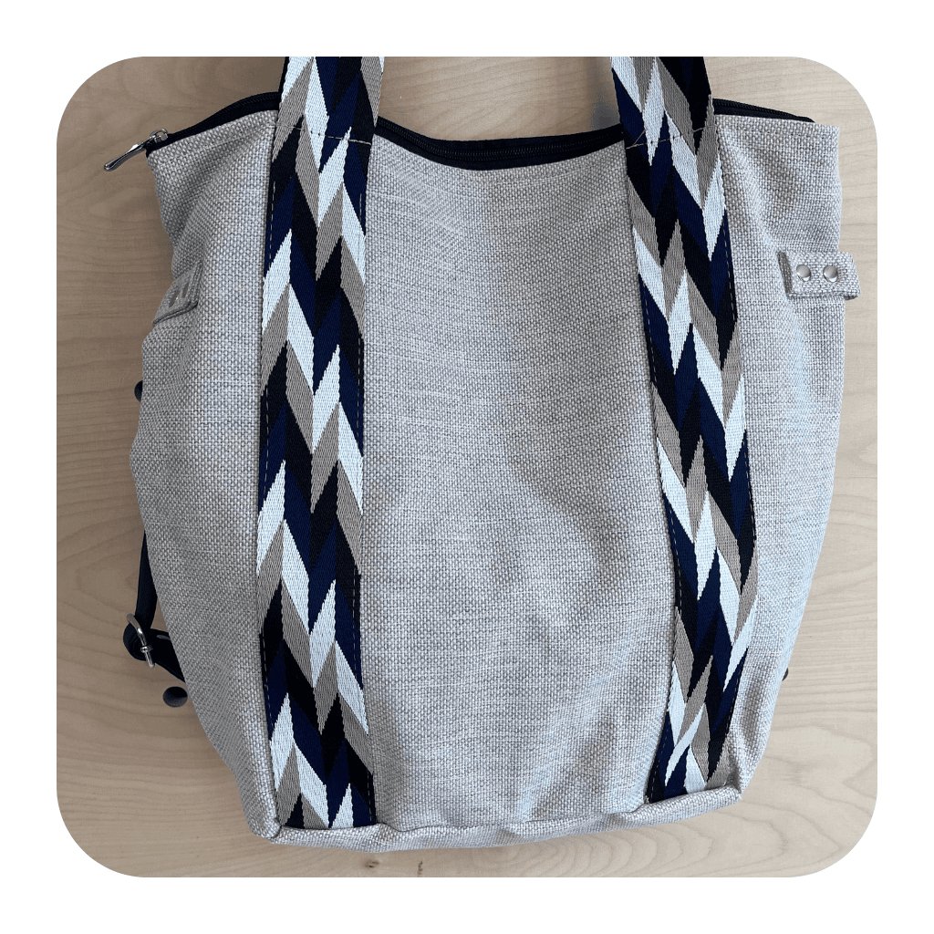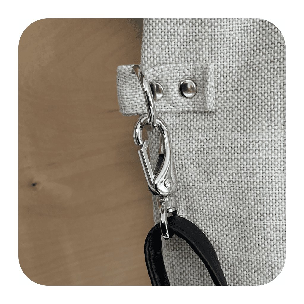 Pevný popruh a čtyři nýty (uši) ze stejného materiálu zajišťují nejen stabilitu, ale i pohodlí při nošení. Tašku můžete nosit volně přes rameno nebo si ji upravit pro nošení diagonálně (crossbody), což vám umožní mít volné ruce a pohodlí během celého dne.