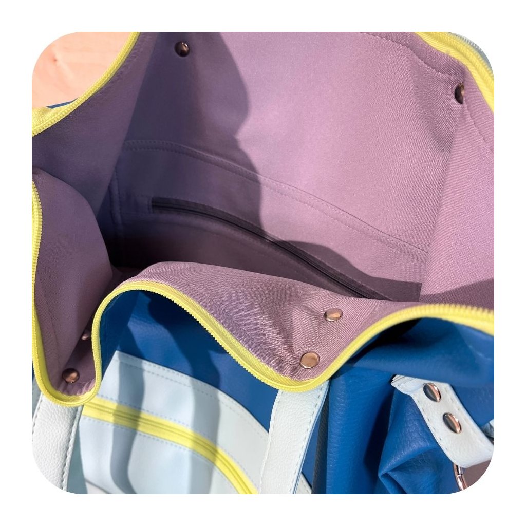 Velká kabelka z eko kůže v modré barvě s mátovými doplňky.